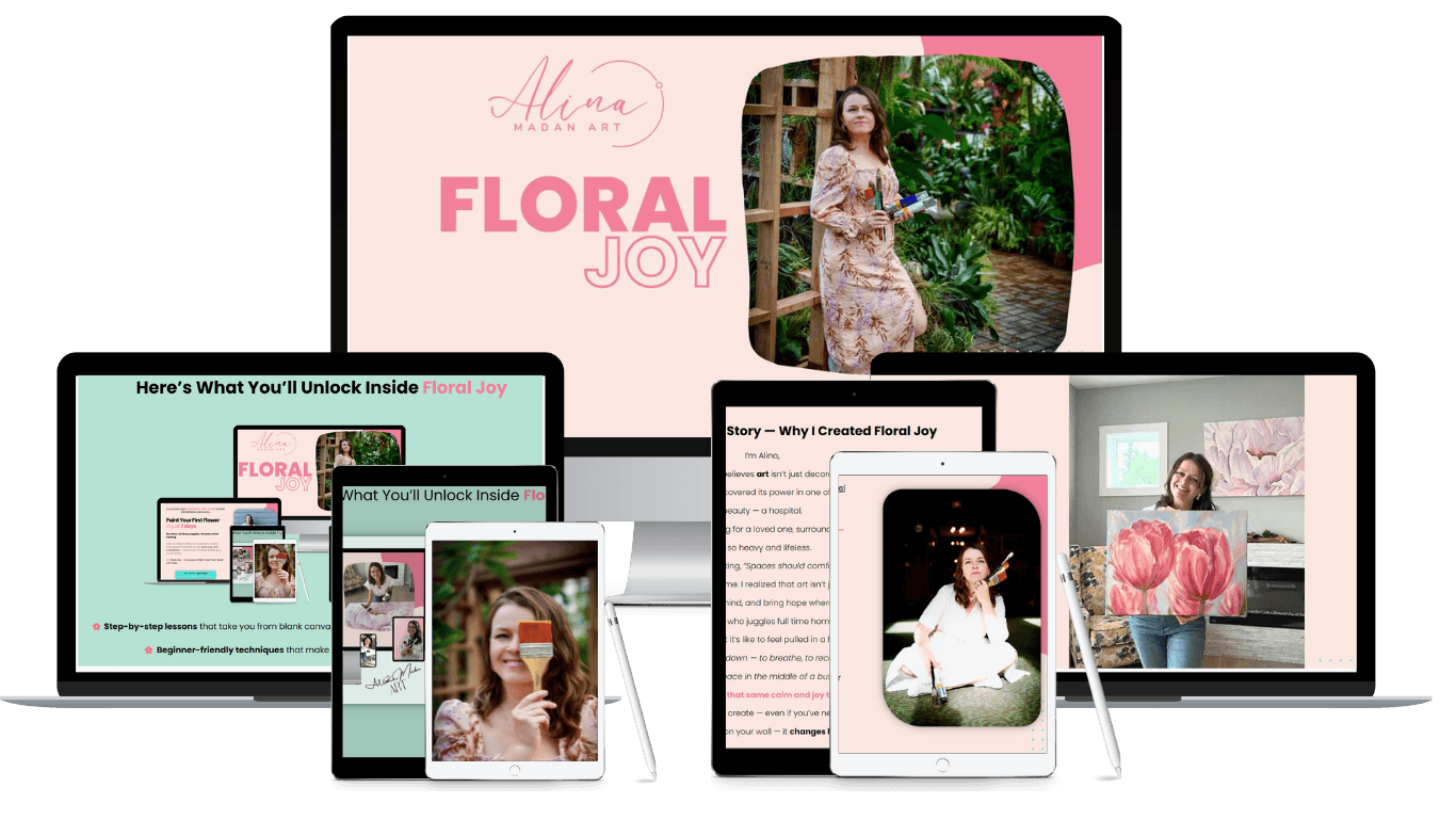 That’s what Floral Joy is all about — a 7-day step-by-step painting experience that helps you create your very first flower painting you’ll be proud to hang on your wall.