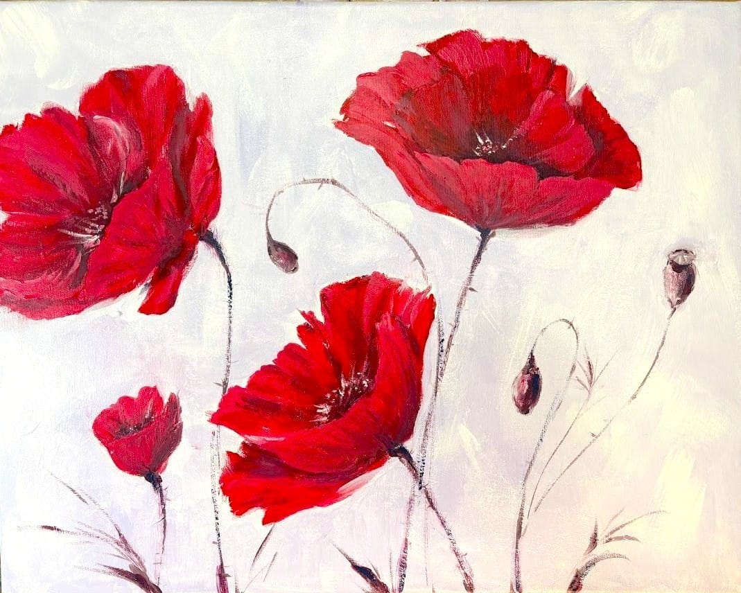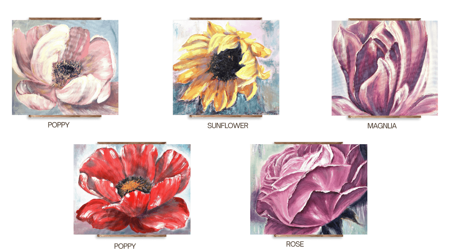That’s less than the cost of a single art class — and you’ll walk away with 5 finished floral paintings.